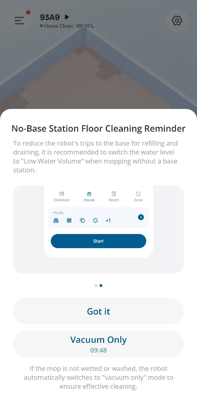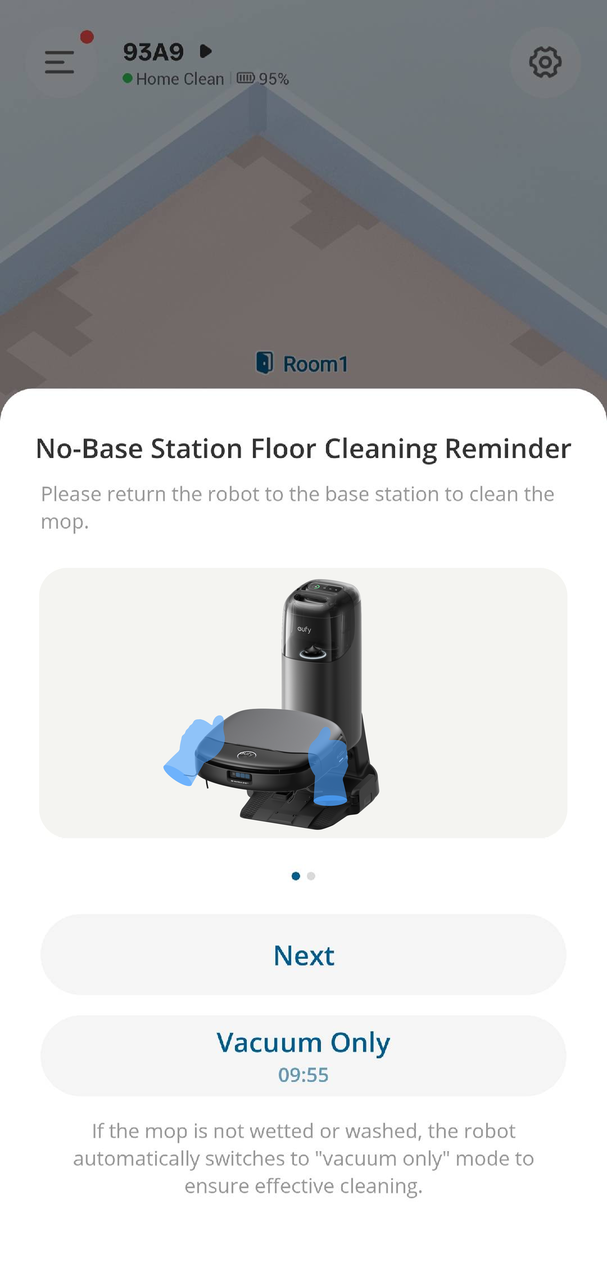 Please note that if the robotic vacuum's water tank is empty and it is not promptly refilled while washing the mop at the base station, the robot will automatically switch to “Vacuum-only” mode.
