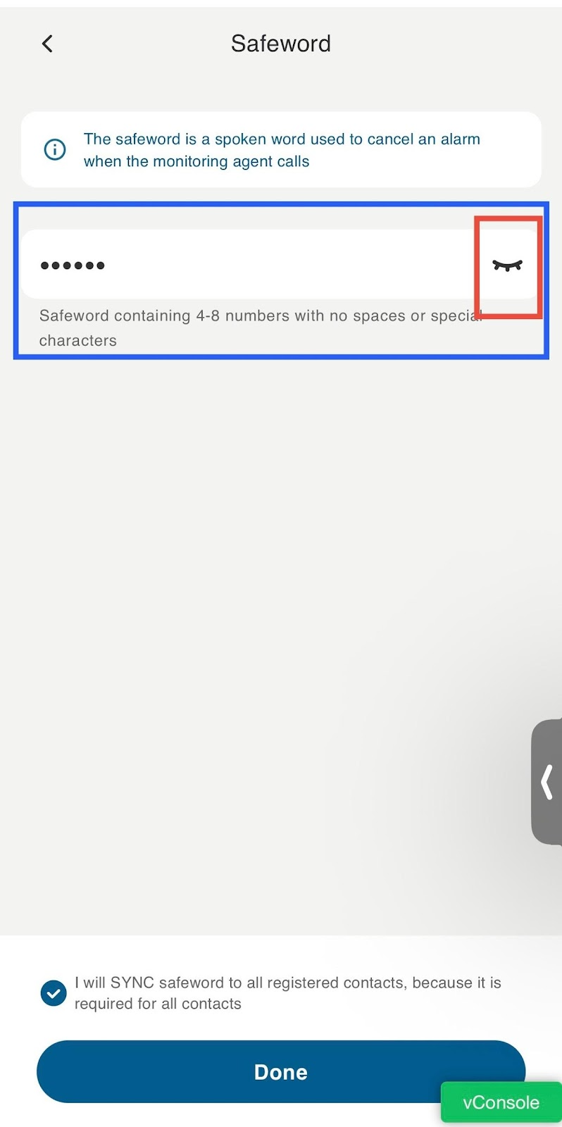 Click on the eye icon to review and modify the safeword →