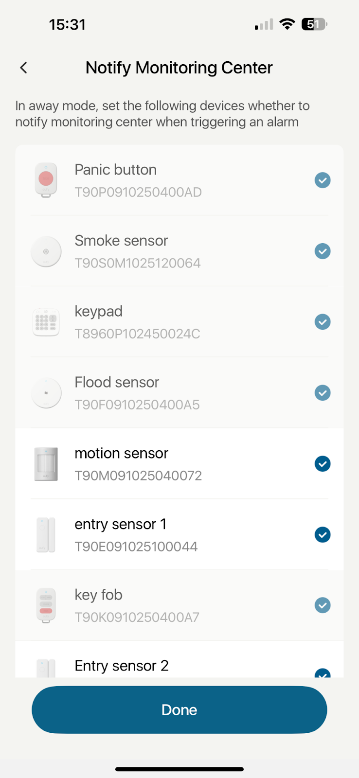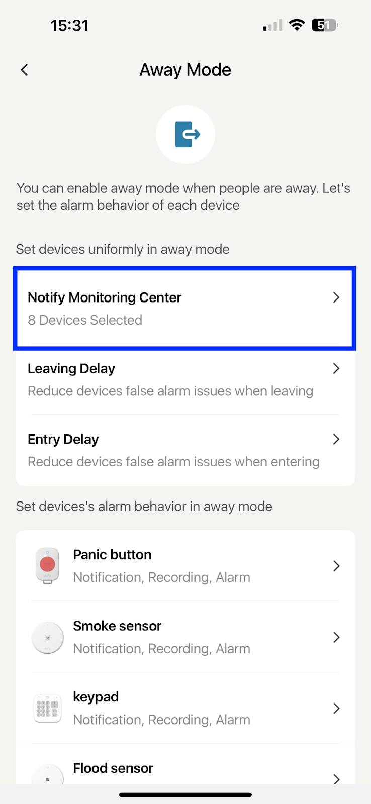 The alarm generated by the selected device will be forwarded to the Monitoring Center.