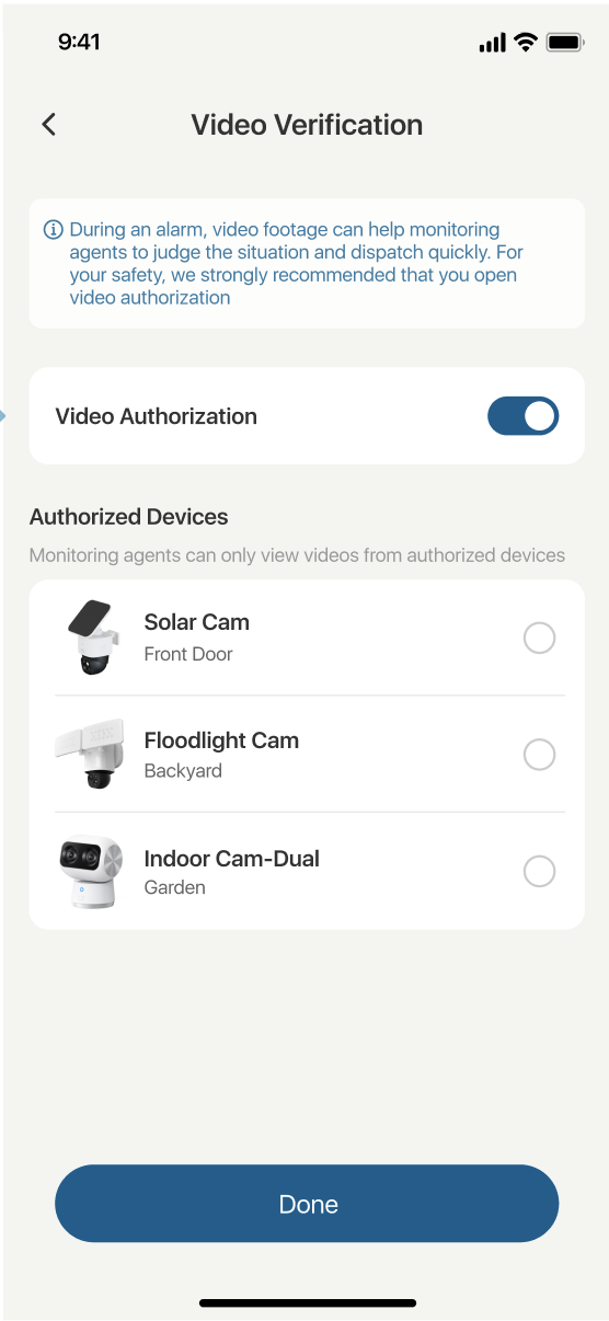 Authorize the monitoring center with access to your camera recordings and live streams. The live agents can quickly react to alarms and look into your emergencies.
