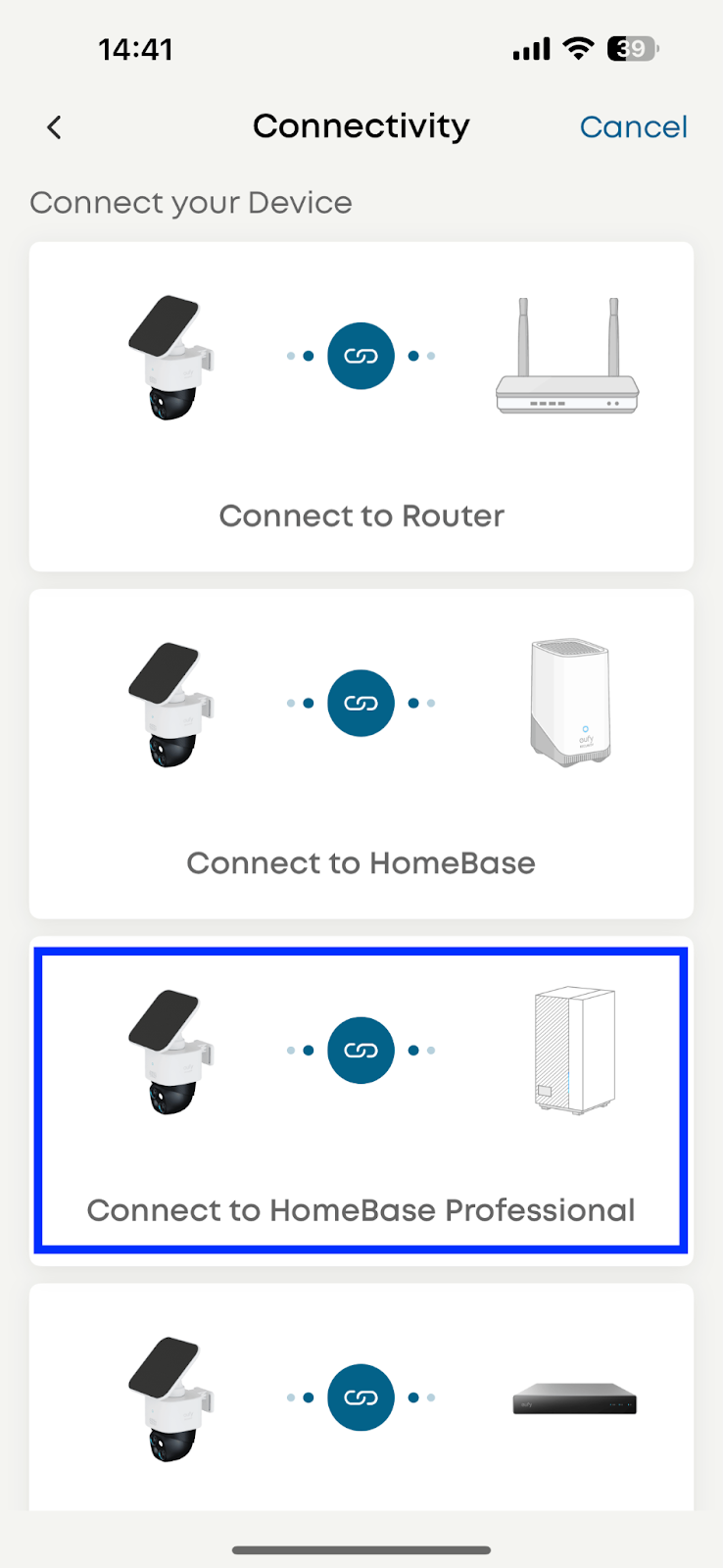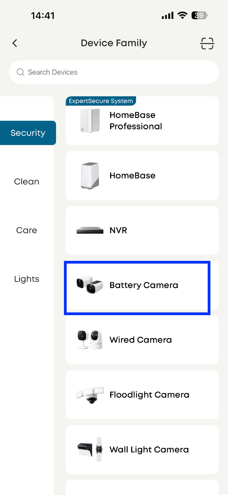 Select “Battery Camera” under the Security section, choose SoloCam S340, and the designated home (where your HomeBase Professional S1 is).