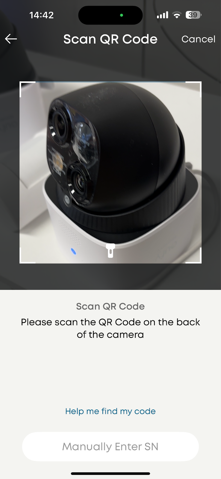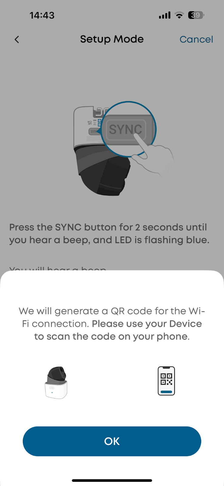 Press the SYNC button on the camera and let the camera scan the QR code on your cellphone
