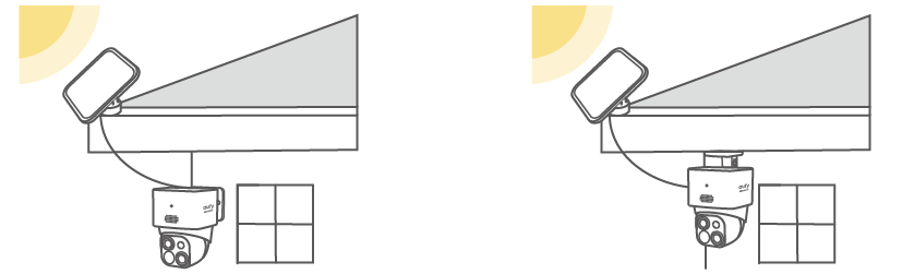 Install the camera in a location that receives at least 3-4 hours of direct sunlight daily to maintain the solar panel's charge. Or Mount the Camera and the Solar Panel Separately (Best for Strong Solar Power). If the camera is blocked, install the solar panel independently and use the provided USB-C extension cable to get strong solar power. The camera can be mounted on a wall or on the ceiling.