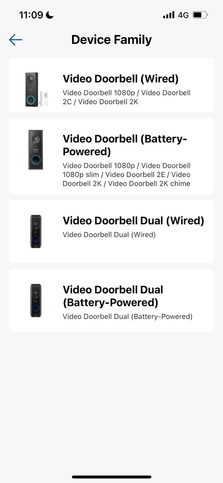 - Device Page > ”+” icon > Device Family > Video Doorbell > Video Doorbell Dual (Battery Powered) > Scan QR Code