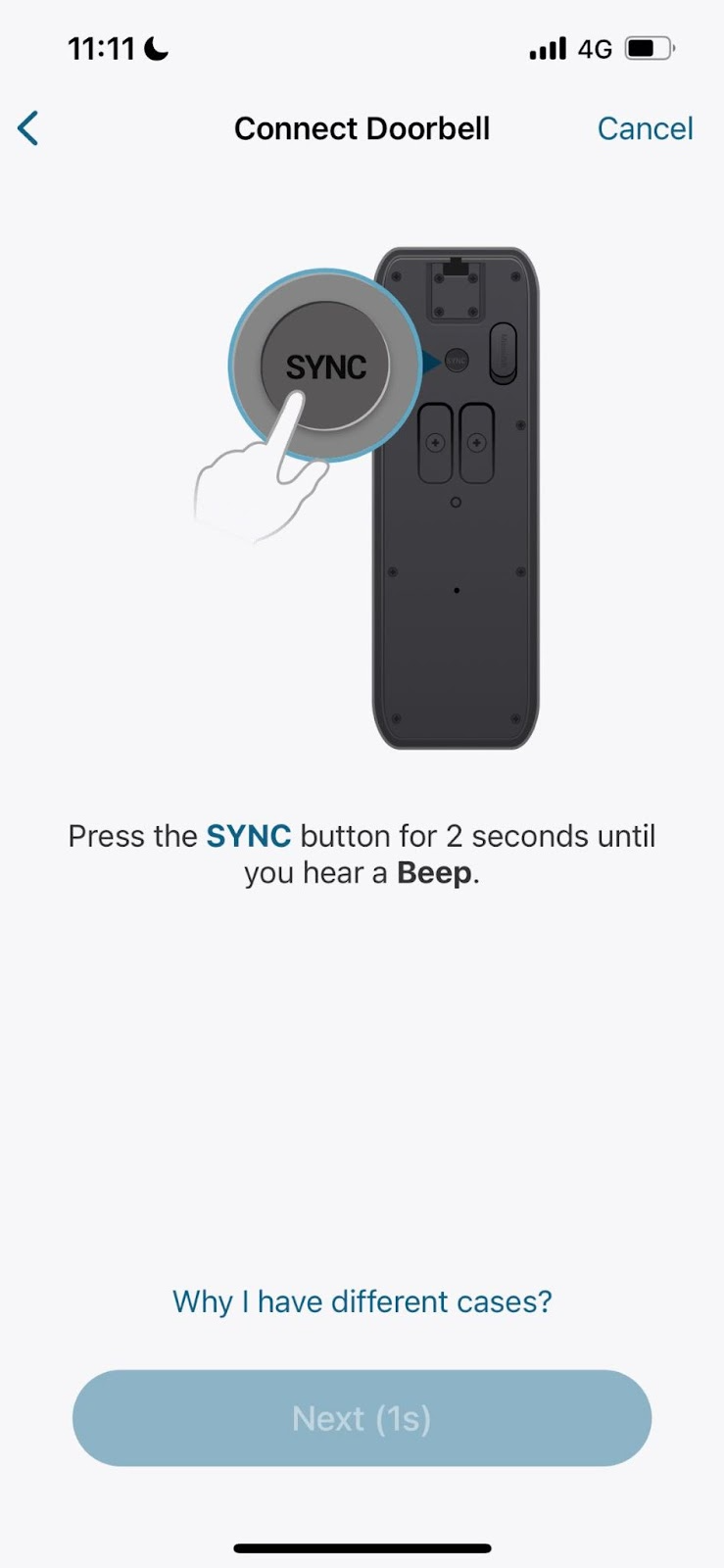 3. Move the doorbell closer to the HomeBase, then press the SYNC button on the doorbell for two seconds.
