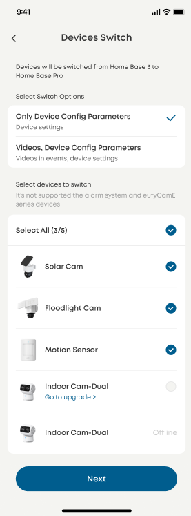 Select the devices you want to migrate to HomeBase Professional. (Note: only those devices are compatible with HomeBase Professional S1 can be migrated)
