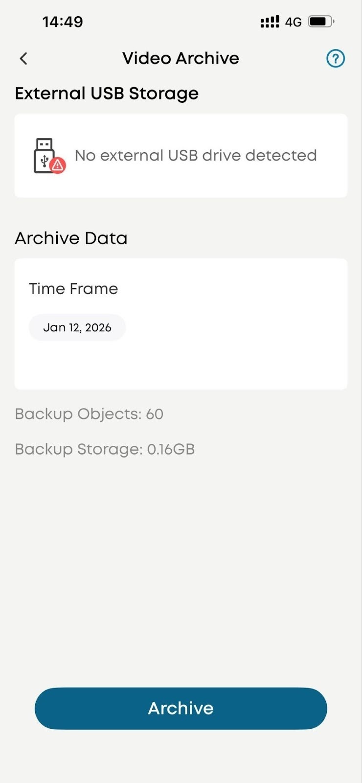 To backup the videos, you can insert a USB Stick first. Then open the App: HomeBase 3>Video Archive> Select Archive Date> Archive