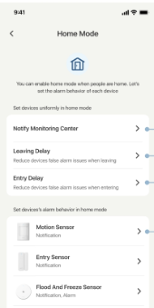 You can set up your security mode. Devices under the security system will respond to events in the way you set up.
