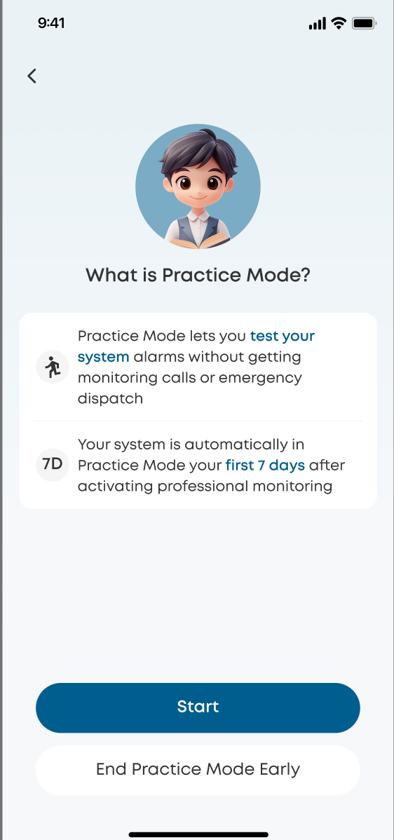 The monitoring center will not dispatch emergency services during Practice Mode, so you can freely test sensors, entry delays, and alarms.