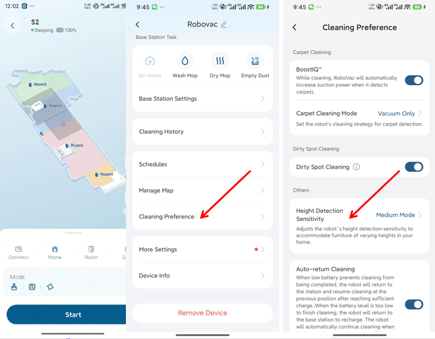 Settings → Cleaning Preference → Height Detection Sensitivity → Medium Mode