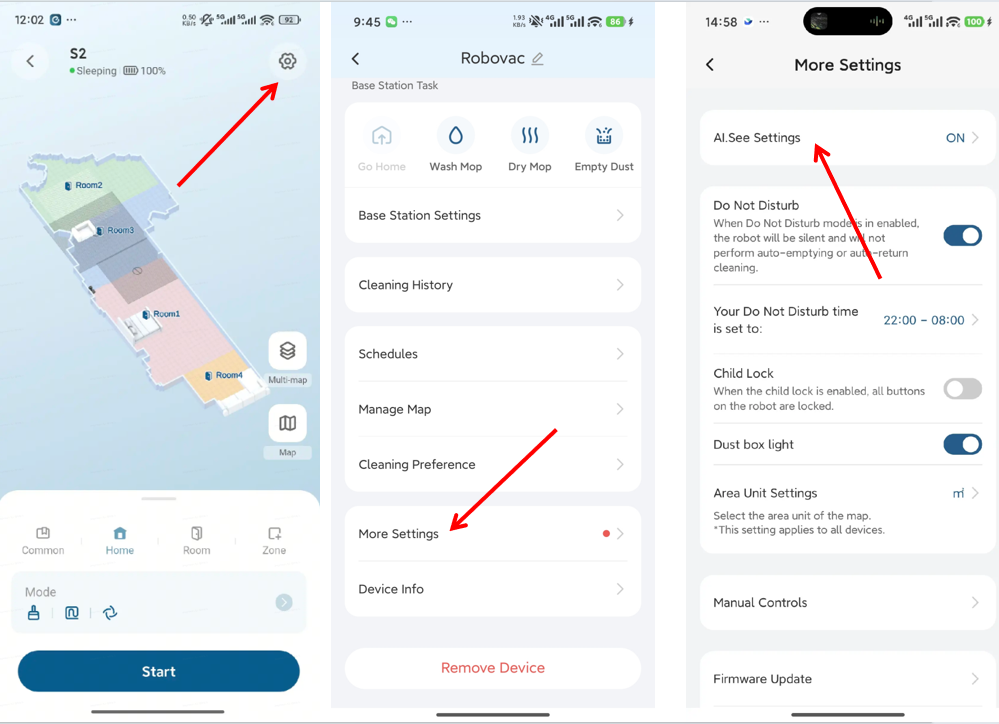 Enable the AI.See feature to enhance the robot’s ability to identify obstacles, allowing smarter avoidance of floor objects.
