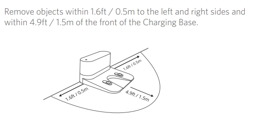 - Make sure to install the charging base at a location that is easily accessible and against a wall. Clear any obstacles within the range described in the image below.