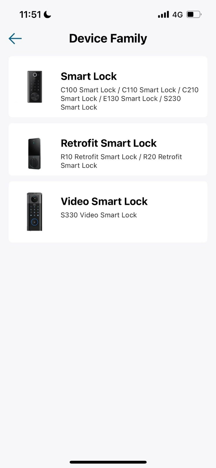 - Geräteseite > „+“-Symbol > Gerätefamilie > Smart Lock > Video Smart Lock.