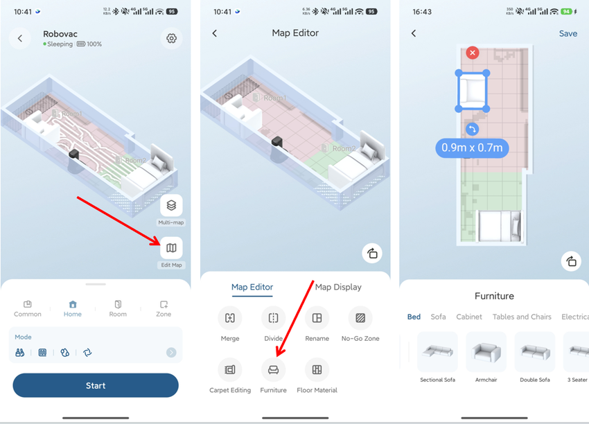 • Um diese Ungenauigkeiten zu korrigieren, öffnen Sie die App und gehen Sie zu Karte → Möbel, wo Sie: