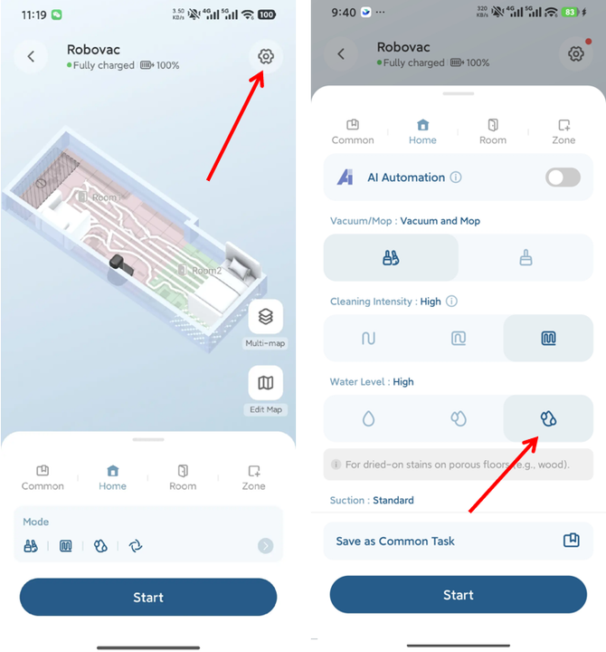 Stellen Sie den Wasserstand auf Hoch, um ein gleichmäßigeres Wischen und ein einheitliches Ergebnis zu erzielen – besonders auf saugfähigen oder strukturierten Oberflächen.
