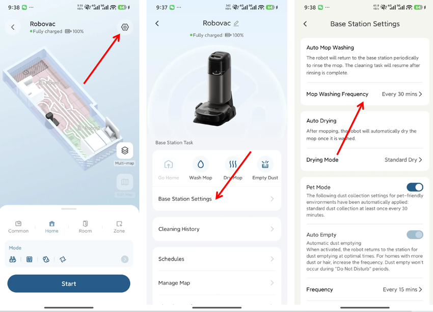 Längerer Gebrauch des Staubbehälters, HEPA-Filters, der Hauptbürste und der Seitenbürsten kann die Staubabsaugung des Roboters beeinträchtigen. Wenn Schmutz nicht richtig entfernt wird, kann die Wischrolle verschmutzt werden und Streifen beim Wischen verursachen.