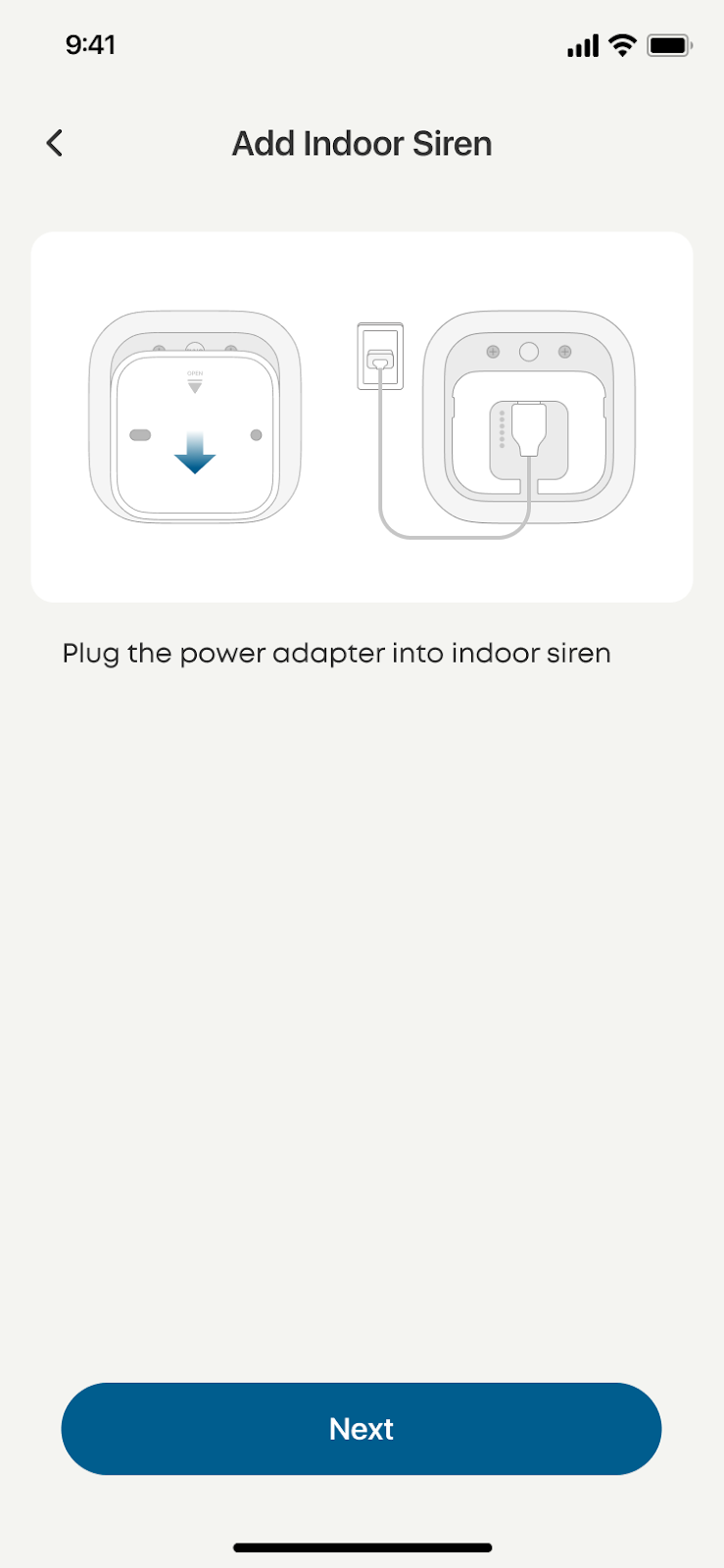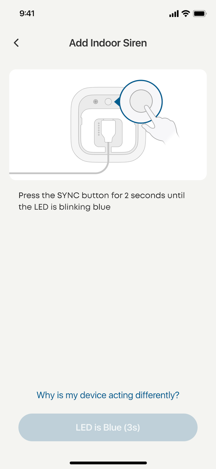 Stellen Sie sicher, dass die Innensirene mit Strom versorgt ist. Drücken Sie dann den Sync-Taste für 2 Sekunden. Die LED sollte blau blinken.