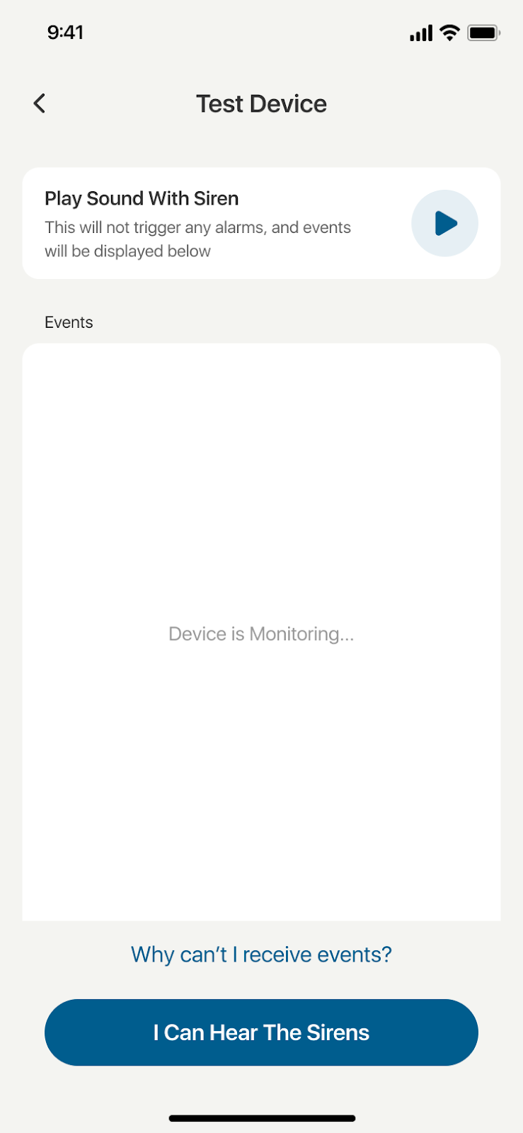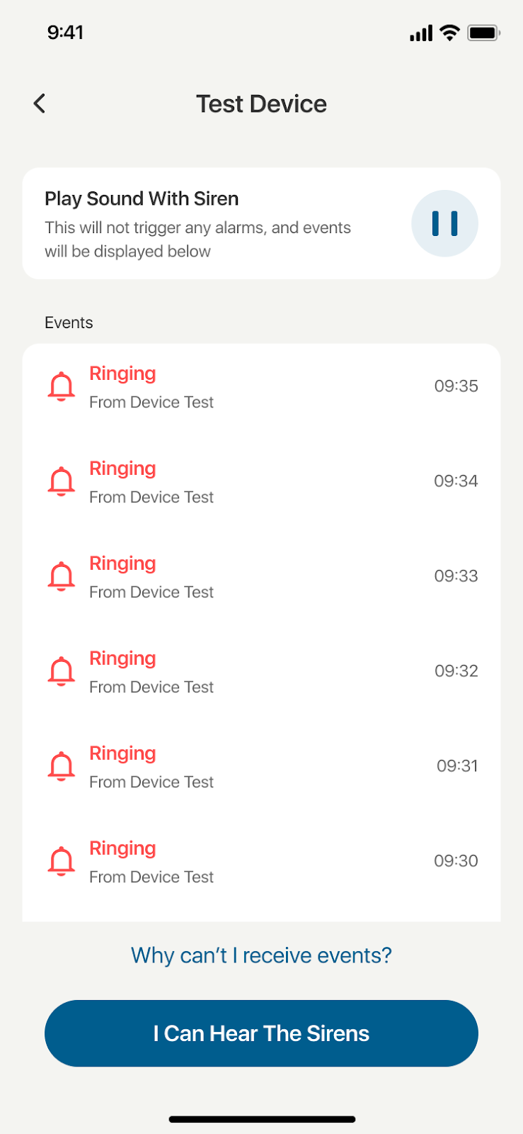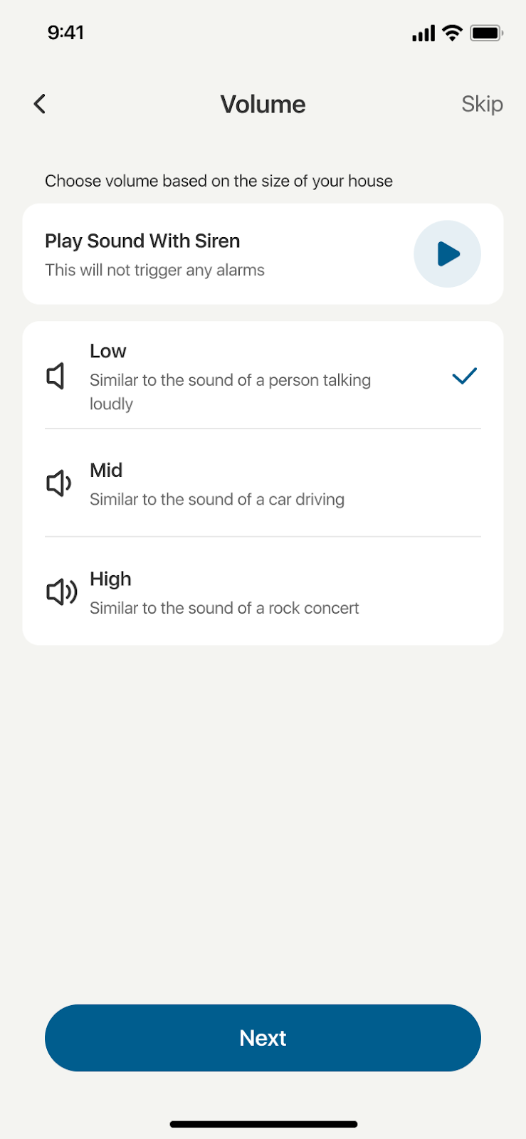 Nachdem die Installation abgeschlossen ist, müssen Sie testen, ob Sie den Ton der Innensirene E20 hören und das Ereignis empfangen können. Anschließend können Sie die gewünschte Lautstärke auswählen: niedrig (60dB/10cm), mittel (85dB/10cm) oder hoch (Standard: 110dB/10cm).