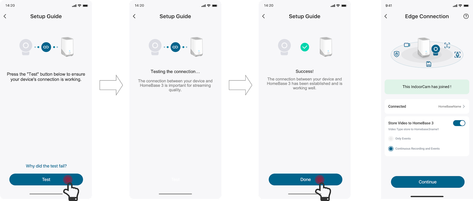 Nachdem die IndoorCam erfolgreich eine Verbindung zu Ihrer HomeBase 3 hergestellt hat, beginnt das System zu testen, ob alles wie erwartet funktioniert. Sobald der Vorgang erfolgreich abgeschlossen ist, kann die IndoorCam mit dem Speichern von Videoaufnahmen auf der HomeBase 3 beginnen.