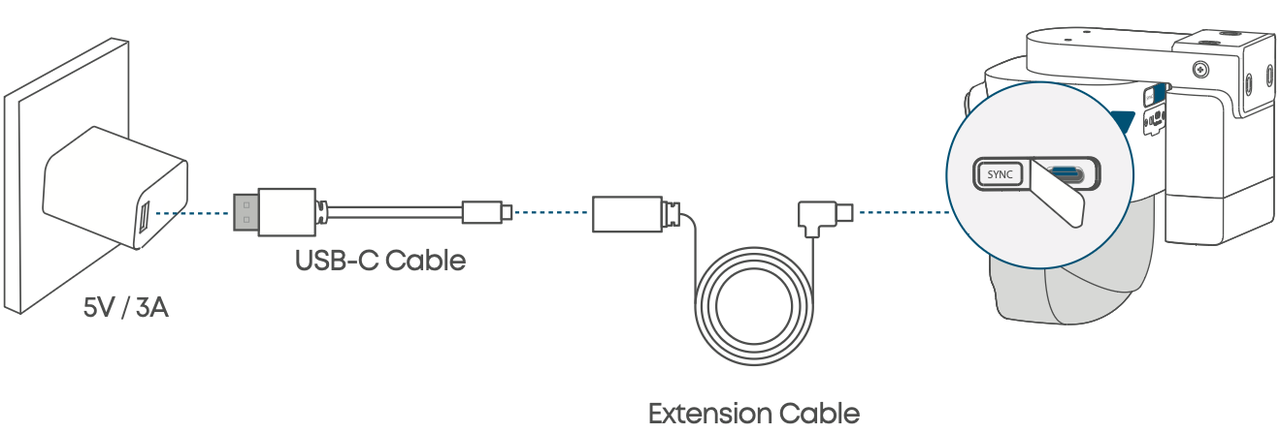 Für den kabelgebundenen Modus schließen Sie die Kamera an einen 5V/3A (oder höheren) Adapter an. Um Stromverlust zu vermeiden, verwenden Sie das mitgelieferte Kabel oder halten Sie die Gesamtkabellänge vom Adapter zur Kamera unter 4,5 m / 15 ft.
