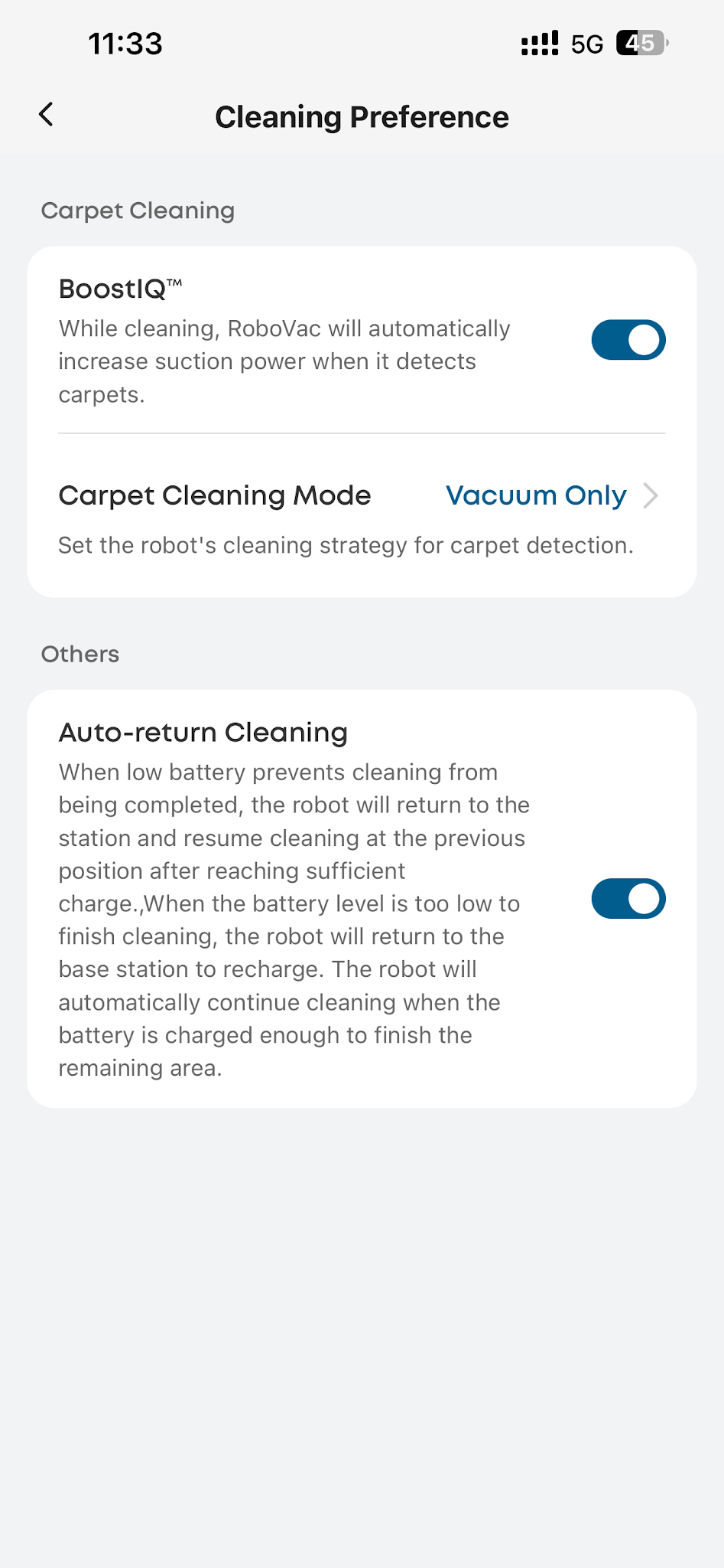 Enable the BoostIQ feature via the app. When the robot detects a carpet, it will automatically increase suction power for enhanced cleaning.