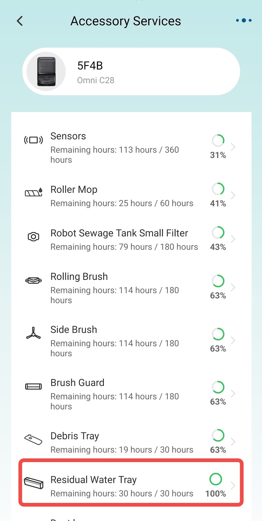 To clean the Residual Water Tray, please follow the instructions provided in the app. You can access them by navigating to Settings > More Settings > Accessory Services > Residual Water Tray.