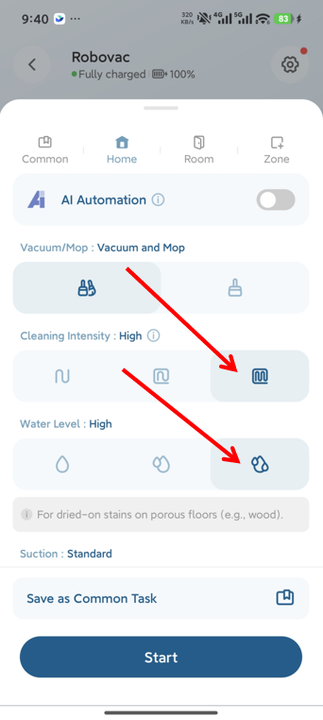 Step 1: Adjust Cleaning Intensity and Water Volume