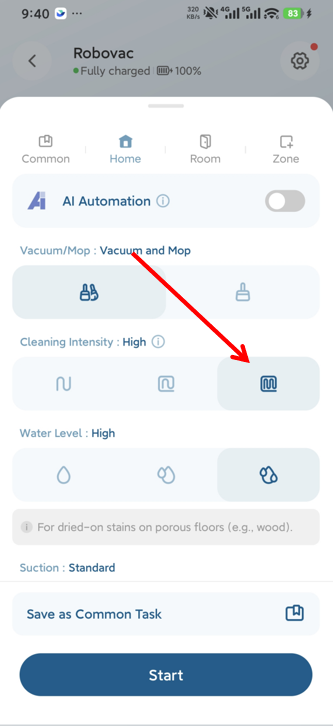 When enabled, the robot will automatically perform intensive scrubbing on heavily soiled areas, such as coffee spills, for enhanced mopping results.