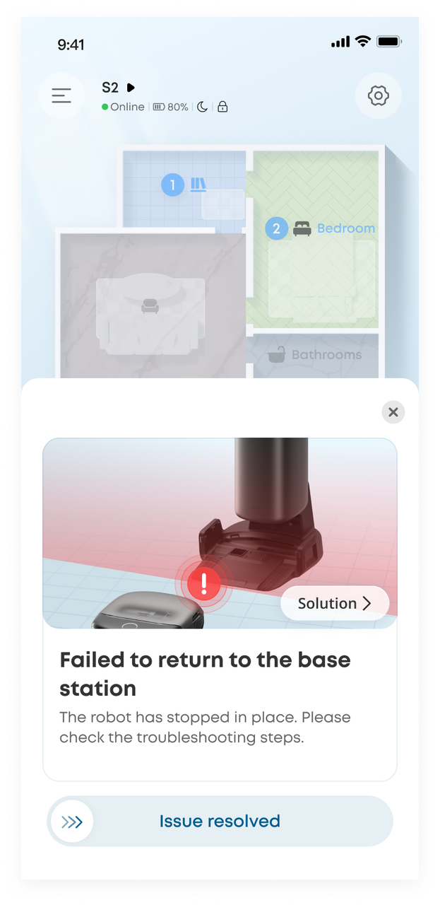 The specific error message or code displayed on the eufy app or voice alert emitted by the S2 robot.