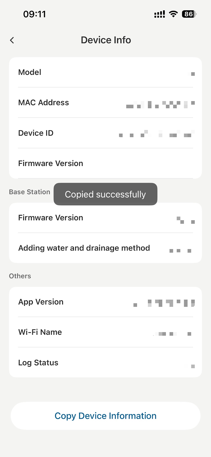 To assist eufy engineers in analyzing your logs, please tap Device Info > tap Copy Device Information.